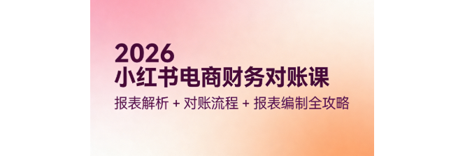 2026 小红书电商财务对账课聚焦平台专属对账实操!从对账核心逻辑、数据导出路径讲起,详解订单、售后、结算单等报表关键字段处理,覆盖收入退款、成本核算、回款匹配、刷